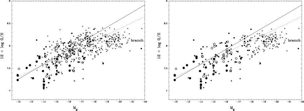 The differences between giant and dwarf galaxies are usually attributed to different chemical evolution of galaxies with different masses (e.g. Lequeux et al. 1979; Ellison et al. 2008; Gavilán et al. 2009; Lee et al. 2006; Tremonti et al. 2004). Thus, more efficient mechanisms seem to be at work in massive galaxies converting gas into stars and/or less efficient ones ejecting enriched matter into the galactic halo or even into the intergalactic medium. While the mass of a galaxy is one of the key physical parameters governing galaxy evolution, its determination is not easy and somewhat uncertain. Therefore, very often the luminosity, which is directly derived from observations, is used instead of the mass. In addition, some authors also use other global characteristics of a galaxy such as Hubble morphological type, rotation velocity, the gas mass fraction, surface brightness of the galaxy, to study correlations between metallicity and macroscopic properties of a galaxy (e.g. Pilyugin et al. 2004; Tremonti et al. 2004).