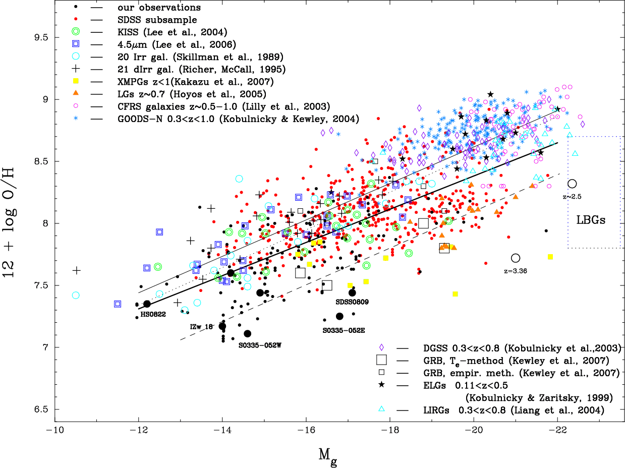 It was shown more than 20 years ago that low-luminosity dwarf galaxies have systematically lower metallicities compared to more luminous galaxies (Skillman et al. 1989; Lequeux et al. 1979; Richer & McCall 1995). This dependence, initially obtained for irregular galaxies, was later confirmed for galaxies of different morphological types (e.g. Lee et al. 2004; Melbourne & Salzer 2002; Vila-Costas & Edmunds 1992; Pilyugin et al. 2004; Lee et al. 2006; Kobulnicky & Zaritsky 1999).