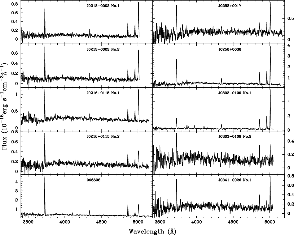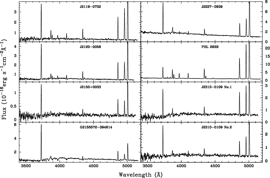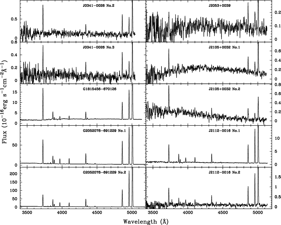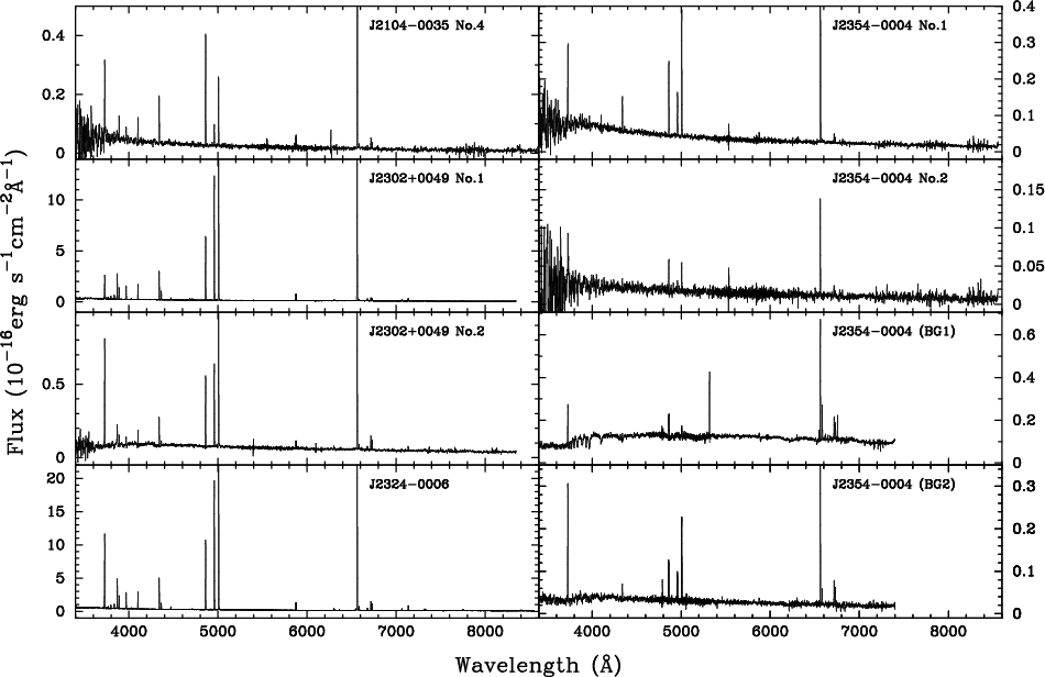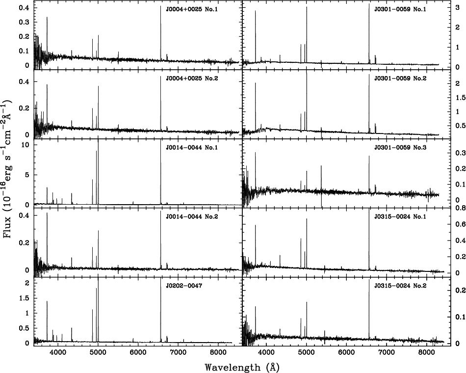 Figure 2: The flux-calibrated and redshift-corrected VLT spectra of the emission-line galaxies. |