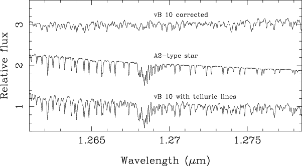 database, and we produced fits using a third-order Legendre polynomial along the dispersion axis and a second-order one perpendicular to it. The mean rms of the fits was 0.03 Å, or 0.7 km s-1. We note that this calibration method may produce systematic errors, or different zero-point shifts in velocity, that have to be removed before deriving precise radial velocities for vB 10. Individual spectra were combined to produce one spectrum for each observing epoch and instrumental setup. In order to correct for atmospheric telluric absorptions, near-infrared featureless stars of spectral types A0-A2 (HD 181414, HD 123233, and HD 189920) were observed close to the observations of our target, although they were not always acquired at the same airmass. The strong hydrogen line at 1.282