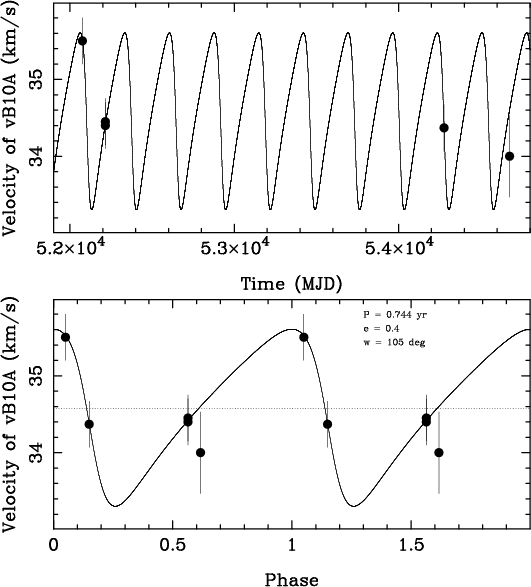 )]. This eccentricity is very close to the one derived from the solution of the combined astrometric and NIRSPEC observations performed by Pravdo & Shaklan (priv. communication). The bottom panel depicts the velocity curve folded in phase with a periodicity of 0.744 yr. For the systemic velocity of vB 10, we have adopted the mean value of all NIRSPEC velocities: 34.57 km s-1, with an uncertainty of 0.30 km s-1. A relatively high eccentricity of e