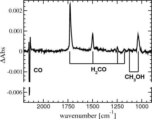 A difference spectrum of a similar experiment but with a much lower flux of 1012 cm-2 s-1 is plotted in Fig. 7. The exposure time here is four hours to reach a higher total fluence of