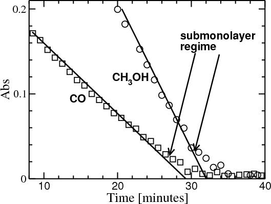 Figure 3: The decrease in integrated absorbance of CO and CH3OH (1035 cm-1) following desorption at a constant temperature of 29 and 135 K, respectively. The arrows indicate the transition points from the multi- to sub-monolayer regime. |