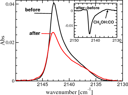 Figure 4: Spectral change of the CO 2143 cm-1 RAIR band before and after H-atom bombardment. The inset shows the corresponding difference spectrum. |