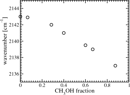 Figure 5: CO RAIR band position as a function of CH3OH content in a CO:CH3OH mixed ice obtained by codeposition experiments. |