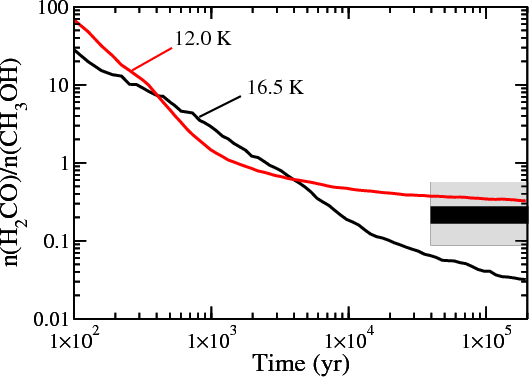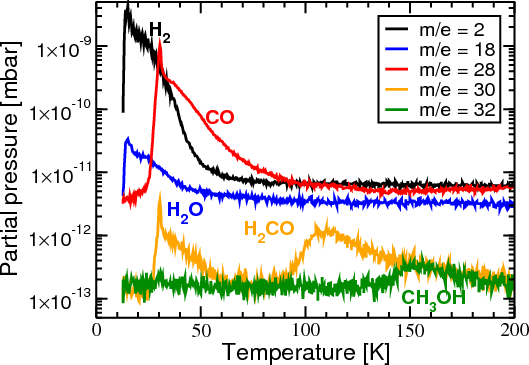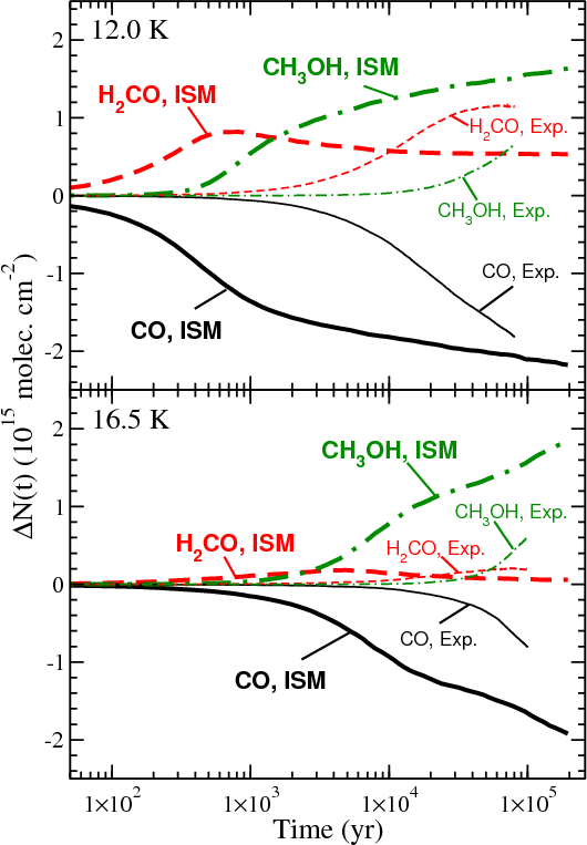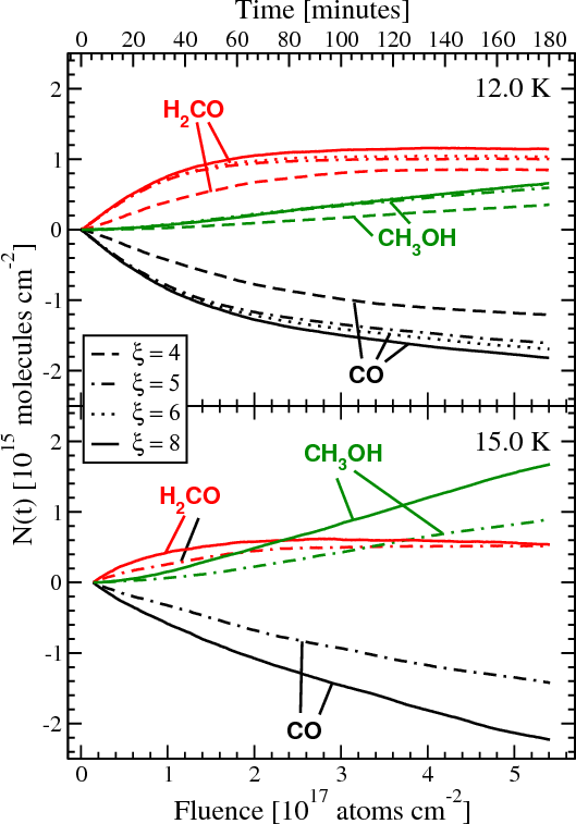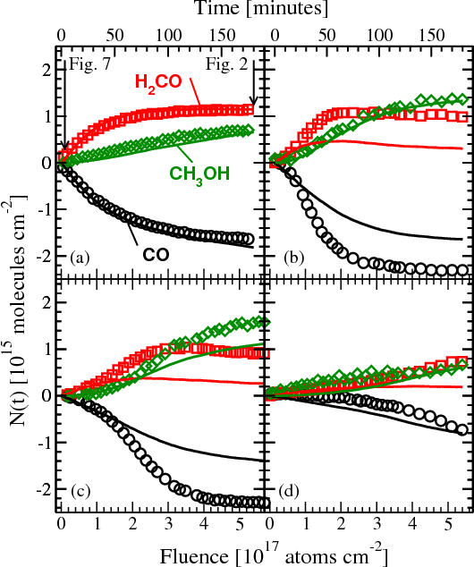 Figure 6a shows the time evolution of the integrated CO, H2CO, and CH3OH signals in symbols. It shows how the amount of CO decreases as the abundance of H2CO increases for four different temperatures. After bombardment with