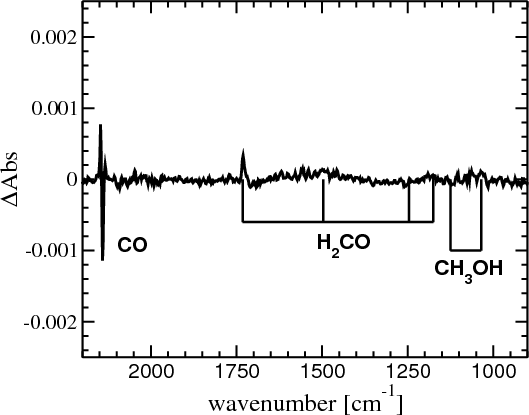 To quantify the use-up of CO and the formation of new products, we have to assume that the apparent absorption band strength is constant during an experiment, i.e., independent of the ice composition. Bouwman et al. (2007) found that the band strength of the 2143 cm-1 CO feature is indeed unaffected within the experimental error by the water content in H2O:CO-ice mixtures up to 4:1. The band strength is expected to behave similarly for a CO:CH3OH-mixture. Furthermore, if the band strength is strongly affected by the ice composition, the total ice thickness determined using a constant band strength should vary in time, whereas the real thickness is constant. Since this does not occur, we estimate that the change in band strength caused by the change in ice composition is negligible and well within our margins of error.