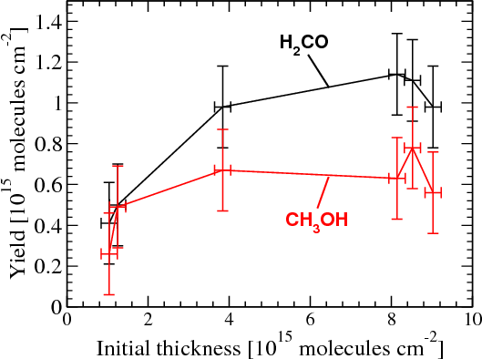 As mentioned in the introduction, the apparent discrepancy between the results by Hiraoka et al. (2002) and Watanabe & Kouchi (2002) has been attributed to a difference in the H-atom flux used in the respective experiments. The setup in our laboratory is able to cover the entire flux range from 1012 to 1014 cm-2 s-1. For high flux, both formaldehyde and methanol are formed as can be seen in Figs. 2 and 6 and in the corresponding work of Watanabe & Kouchi (2002).