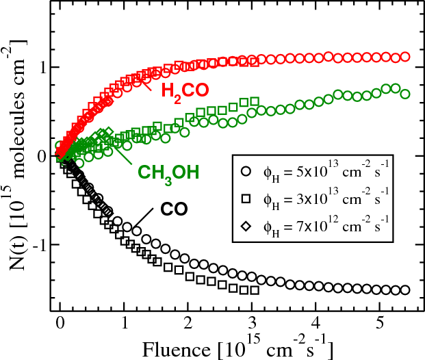 H atoms cm-2, the formation of methanol kicks off at the expense of the growth of the H2CO abundance. Similar trends of abundance evolution as a function of fluence are reported by Watanabe et al. (2006). This indicates that the fluence is determined with relatively high accuracy since in both experiments different atomic sources (Tschersich vs. microwave induced plasma) and different calibration methods are used.