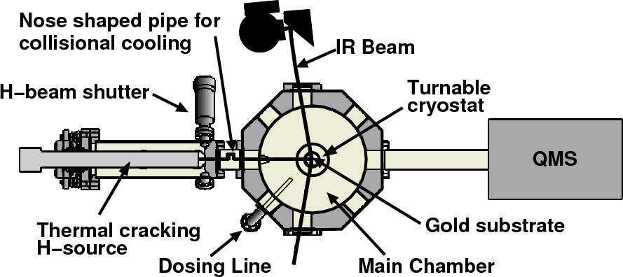 The determination of the upper limit to the H-atom flux is more elaborate and involves several steps. Figure 1 shows that the hydrogen atoms travel from the source through the atomic-line chamber to a quartz pipe, where the atoms are collisionally cooled and then travel through the main chamber onto the substrate. The final H-atom flux is then determined by