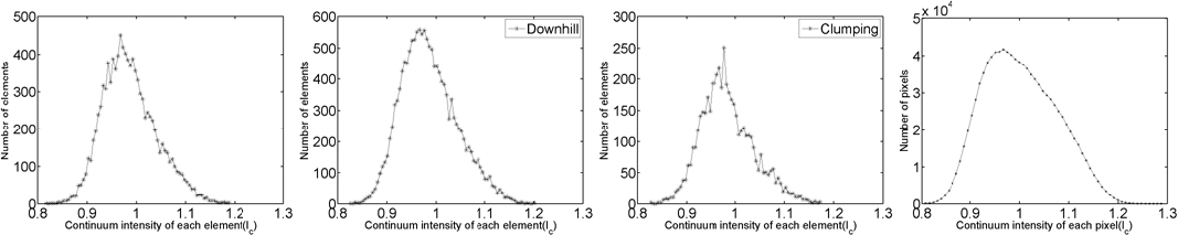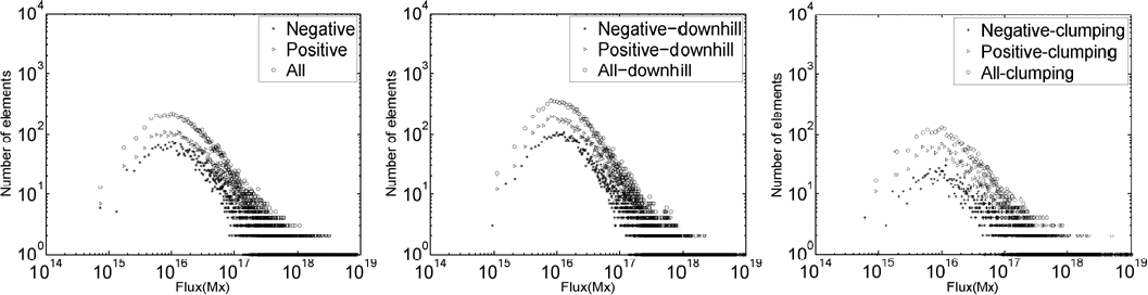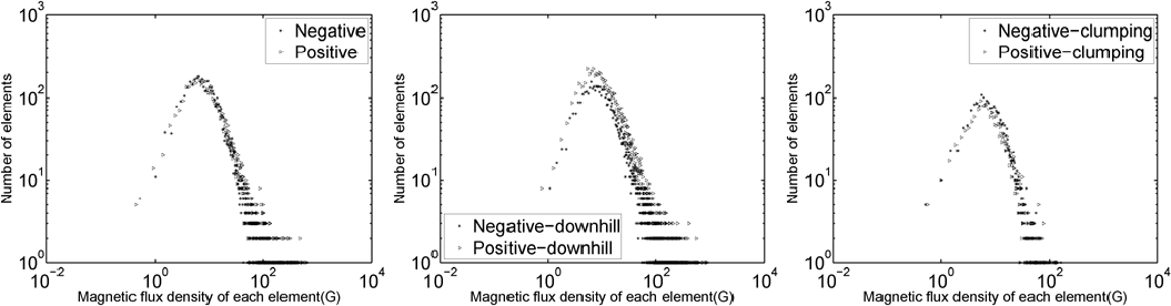 Here, we introduce the mark-controlled watershed method to identify magnetic elements automatically. This method is generalized from watersheds, which is a popular segmentation method for separating touching or adjacent objects (Courses & Surveys 1999; Beucher & Meyer 1993; Tremeau & Colantoni 2000; Haris et al. 1998). However, it has been reported that the watershed algorithm often leads to over-segmentation (Vincent 1993), meaning that the method may partition one magnetic element to a set of small magnetic elements. This may lead to error in the statistics. As we can detect the center of a magnetic element effectively, we use the center as a marker to avoid over-segmentation. Eight neighbors of a marker should have the same polarity and be smaller than or equal to the absolute value of the marker. Furthermore, if the distance between two markers is less than 3 pixels, the pixel with a greater magnetic flux density is marked, while the other is not marked. When using mark-controlled watershed, the pixels around the marker are combined as a magnetic element, and other local maxima/minima are not considered. As we know, all the local maxima/minima are used as seeds to cluster magnetic elements in the traditional watershed, which leads to over-segmentation. However, there is a one-pixel wide boundary line not included in the magnetic element when the watershed technique or the marker-controlled watershed method is used. In this work, we add the boundary pixels to each magnetic element. If several magnetic elements meet at the same boundary pixels, the pixels are randomly allocated to one of these elements. Based on the above idea, we combined the prior information of magnetograms to mark the center of each magnetic element first and used these marks to avoid over-segmentation.