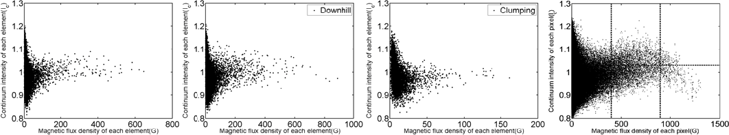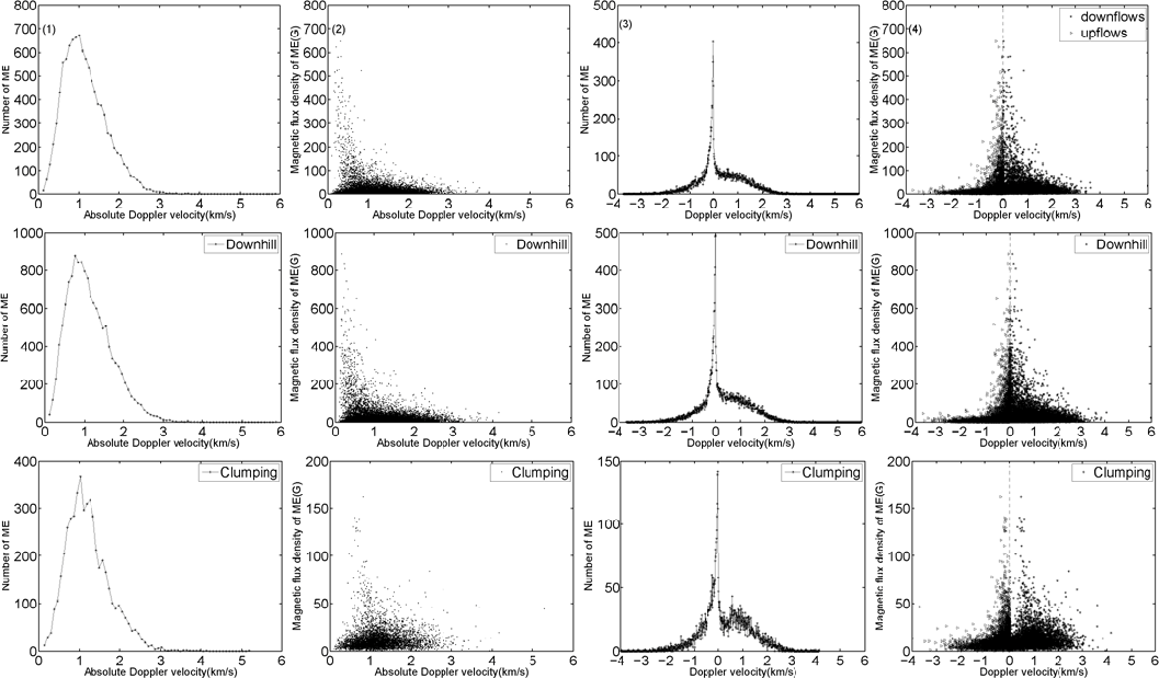 Mx for the whole region; (3) the relative continuum intensity distribution at the locations of magnetic elements reaches a peak at 0.97, which shows that the majority of magnetic elements located at the areas where the relative continuum intensity is less than its average. The relative continuum intensities in the areas with strong flux density are the median, meaning that the strong magnetic elements are usually located at the boundary of granulation; (4) the absolute Doppler velocity distribution at the locations of magnetic elements reaches a peak at 1.00 km s-1, and the majority of weak magnetic elements located at the areas where the absolute velocity is greater than 1.00 km s-1; (5) strongly magnetized regions only have weak absolute Doppler velocities. The absolute velocity is lower than 1.00 km s-1 in the regions where the magnetic flux density of elements is higher than 100 G.