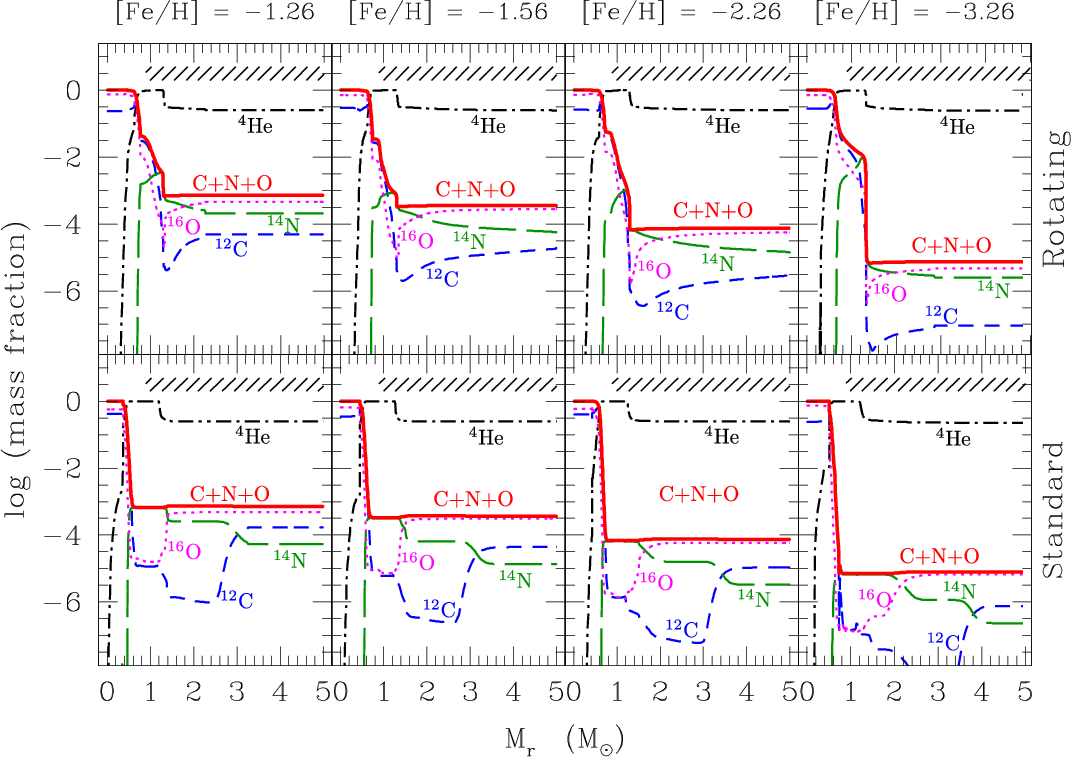 Results. During central He-burning, rotational mixing transports fresh CO-rich material from the core towards the hydrogen-burning shell, leading to the production of primary 14N. In stars more massive than M4 M