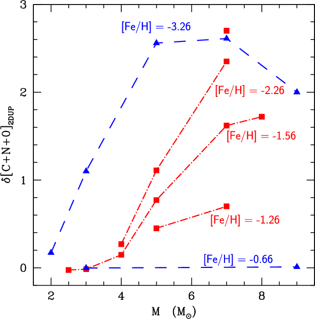 , the convective envelope reaches this reservoir during the second dredge-up episode, resulting in a large increase in the total C+N+O content at the stellar surface and in the stellar wind. The corresponding pollution depends on the initial metallicity. At low- and intermediate-metallicity (i.e., [Fe/H] lower than or equal to