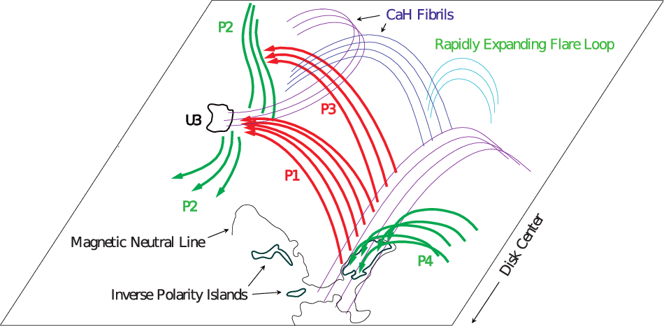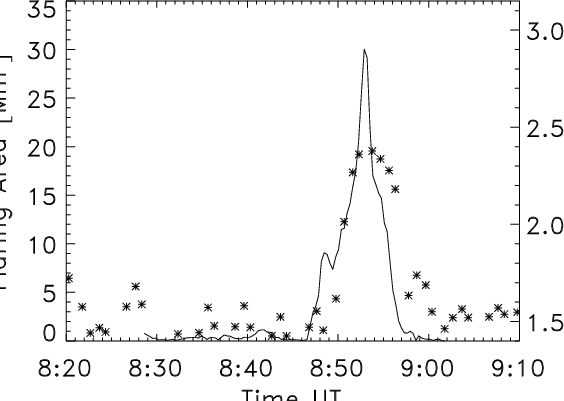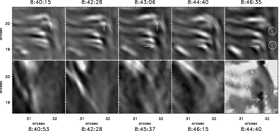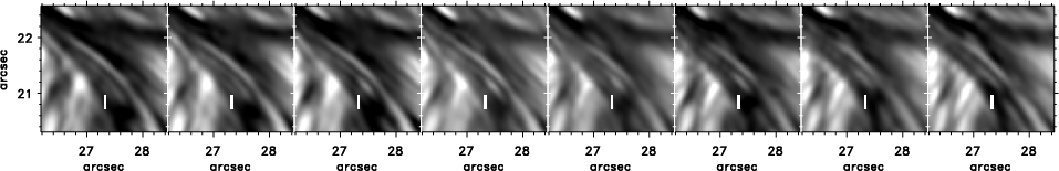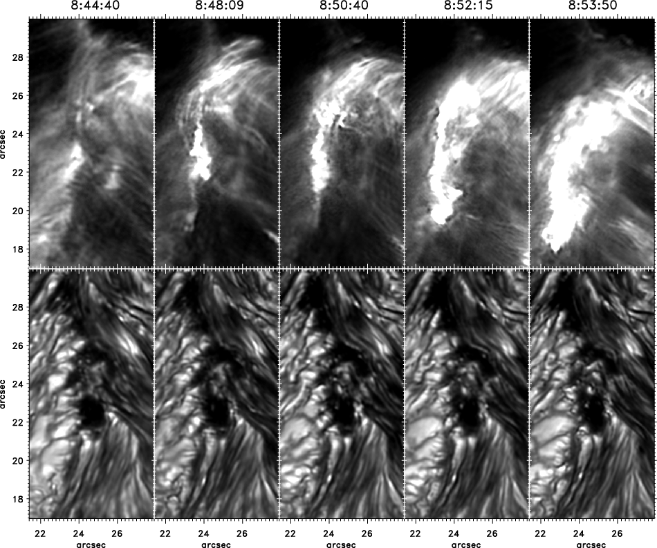 Fast motions were also detected in the chromosphere and upper photosphere. Apart from a fast moving cloud visible in the Ca II H line-core images (see above), we found several bright features flashing up in the Ca II H line-wing images. The simplest explanation for these flashes is a strong blueshift of the Ca II H line in these regions. The line-wing images were obtained approximately 0.6 Å out of the line centre. This value corresponds to blueshifts of 45 km s-1. We may, therefore, assume velocities of several 104 m s-1. Beside these flashes, the only feature visible in the Ca II H line-wing and related to the flare, which lasts longer than a few images, is the outgoing brightness front of a rapidly expanding branch of loop-like Ca II H fibrils. The front, visible in the line-wing, might be assumed to correspond to the footpoints of the loop-like structures. There the chromospheric magnetic field lines should be mainly vertical which is consistent with fast upflows.