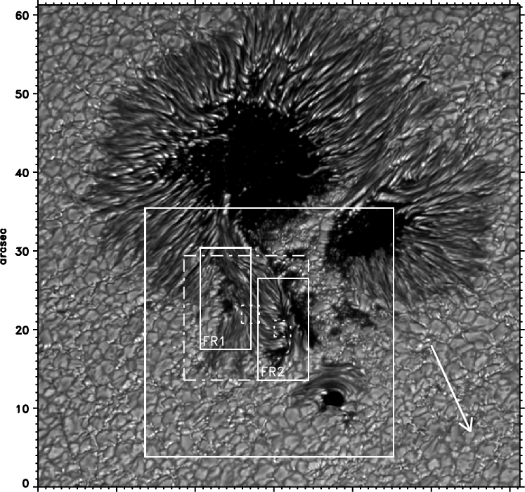 Figure 1: Continuum image (broad band at 6302 Å) of the trailing sunspot in NOAA 10904 on August 13, 2006, 8:44:31 UT. The solid square marks the disturbed penumbra region as displayed in Figs. 2, 3, 5-7, 9, 10, and 13. The two solid rectangular boxes mark the two flare regions shown in Figs. 14-16 ( right) and Figs. 17-19 ( left). The dash-dotted square marks the subregions displayed in Fig. 12 and the small dotted squares show the subfields displayed in Figs. 8 ( left) and 21 ( right). The white arrow points towards disk centre. |
