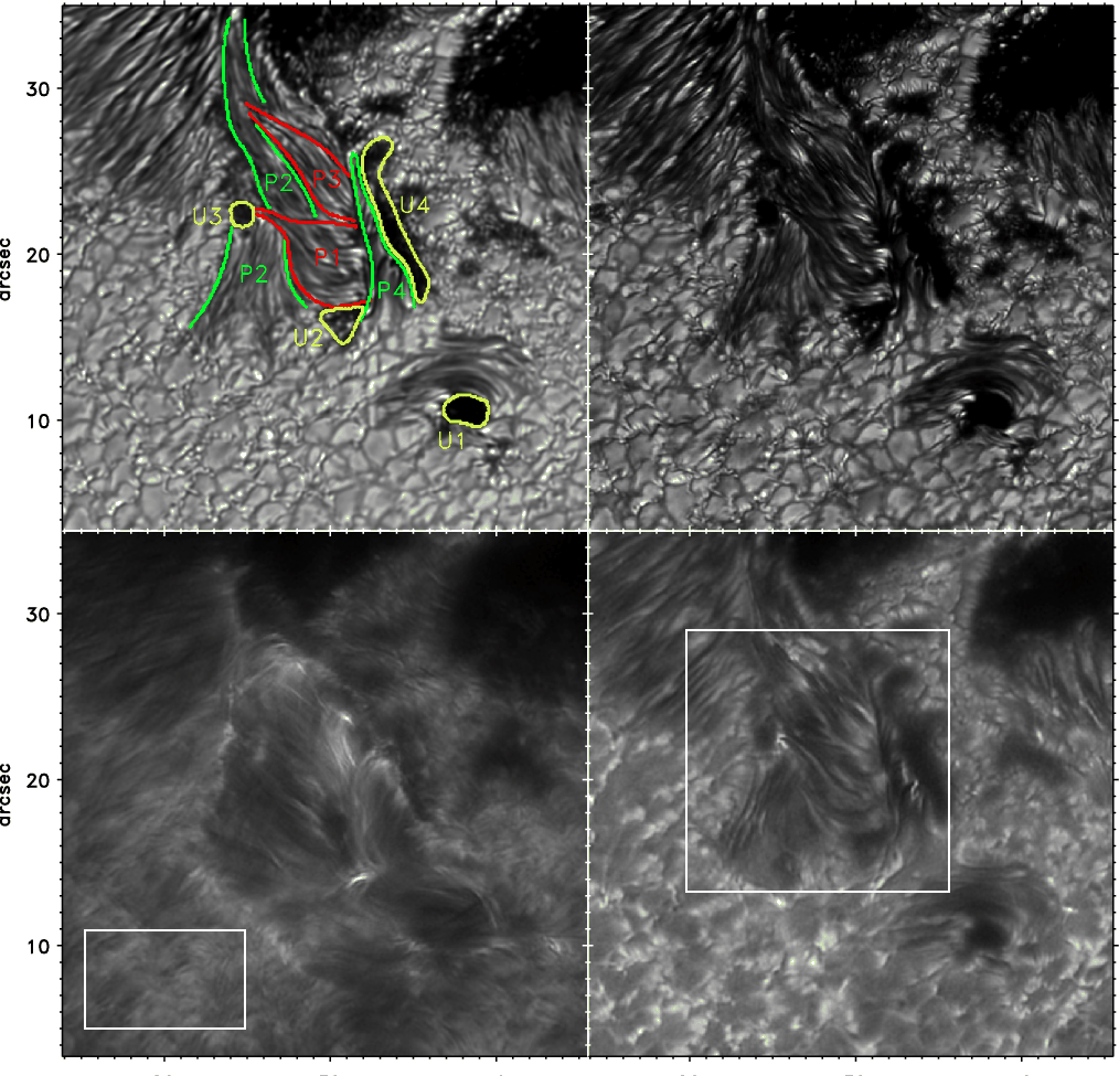 Figure 2: Region of interest as observed on August 13, 2006 at the onset of the flare. Upper left: red continuum at 8:45:11 UT, upper right: G-continuum, lower left: Ca II H line centre, lower right: Ca II H-0.6 Å. The images from the blue channel were obtained at 8:44:59 UT. In the red continuum, image the individual branches of the disturbed penumbra region and four small umbrae are outlined. The penumbral branch P2 is divided into two parts. The region inside of the white box of the Ca II H line-centre image is used to determine the mean Ca II H brightness of the ``quiet'' Sun; the white box in the Ca II H line-wing image marks the subregion shown in Fig. 12. Coordinates are given relative to the origin of Fig. 1. |