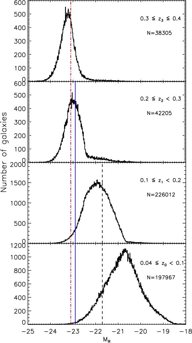 10.5) star forming galaxies from SDSS-DR5 (Sloan Digital Sky Survey-data release 5), using different redshift intervals from 0.04 to 0.4.