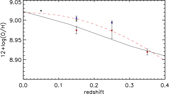 0.4 < z < 1, finding that metallicity is lower at higher redshift by 0.15 dex, for the same stellar mass. Also, Maier