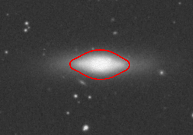 Figure 10: A nearly edge-on photograph of lenticular galaxy NGC 2549 (Courtesy of Sloan Digital Sky Survey) with superposition of an oil film's ``steep profile'' outline on the lenticular galaxy's bulge. |