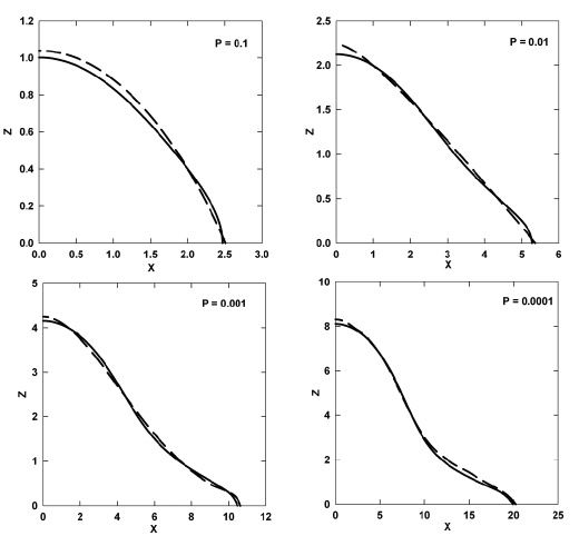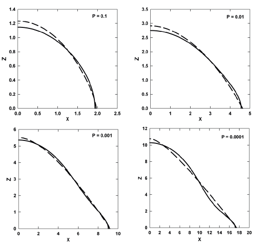 The obtained results are given in Figs. 2-5, which show that in each case the minor axis of the galaxy isodensity contour increases as a consequence of an increase in its major axis transforming the galaxy isodensity contour into a ``steep profile''.