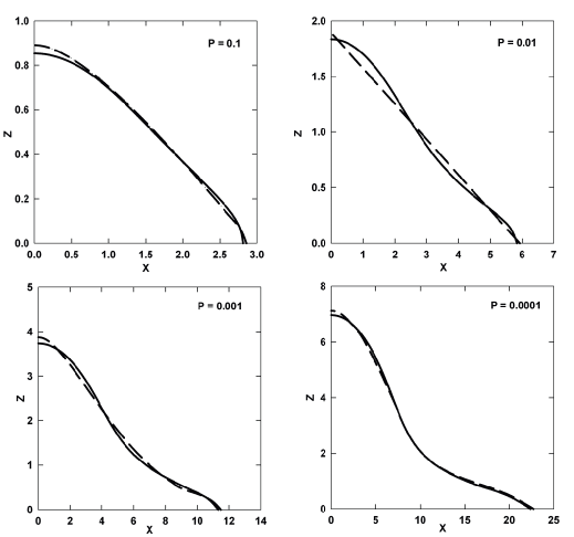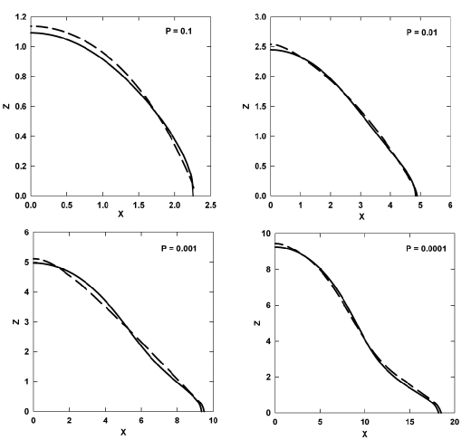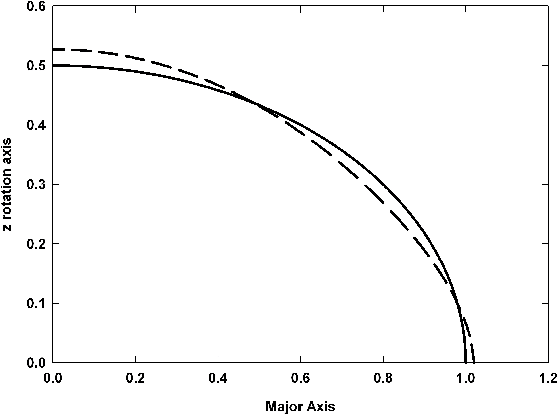 Figure 2: Simulation of the effect of a circumferential equatorial disc on the shape of galaxy isodensity contours (solid curve) with aspect ratios = 0.6 and densities P = 0.1-0.0001, which all change into ``steep profiles'' (dashed curves). |