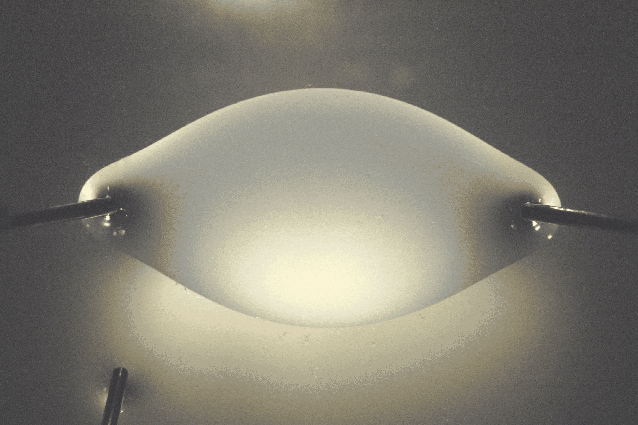 Figure 1: Photograph of a ``steep profile'' induced by applying traction in the 180 degree meridian to an oil film floating on water. The tractional pins extend into the oil film and not into the water below. |