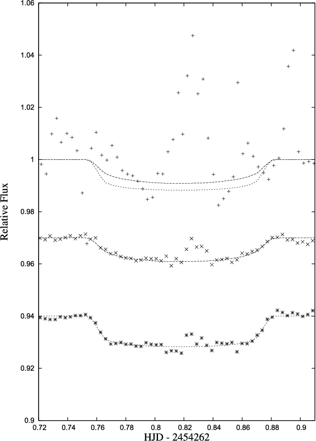 are the planetary radius, stellar radius and semi-major planetary orbital axis, respectively). We estimated our errors by using the scatter about the fit between the model and data, excluding the data points containing the flare. We fixed the period to P=3.10129 days, as given by Pont et al. (2007). To determine the effect of the flare on the transit depth, we computed fits both with and without the region of the lightcurve (HJD = 2 454 262.81 to 2 454 262.84) containing the flare.