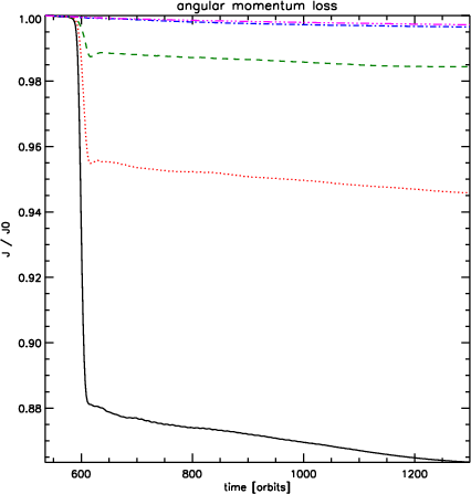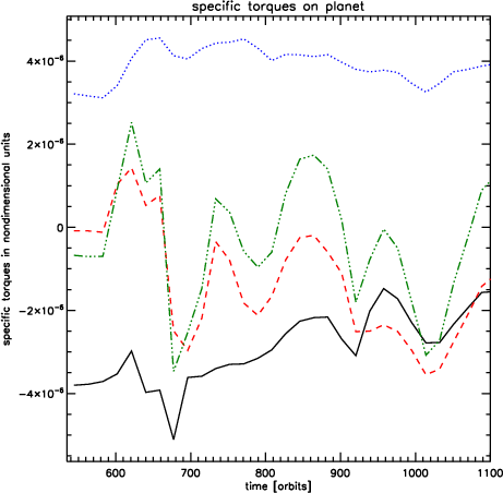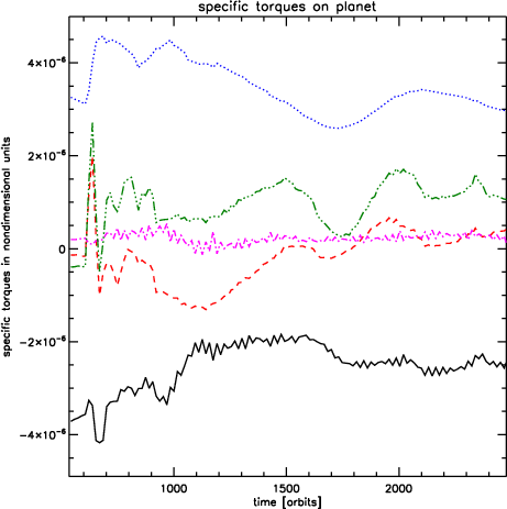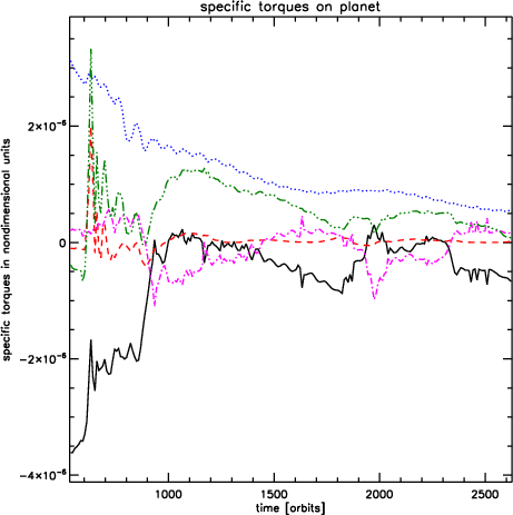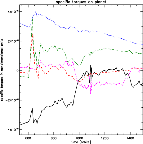 As we have seen in Fig. 18, the planet in model 8 (q=5) behaves very similarly to the one in model 1, for which there was no external perturber. The long term decline in inner and outer disc torques shown in the lower right panel of Fig. 20 is due to accretion of the disc by the planet.