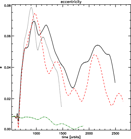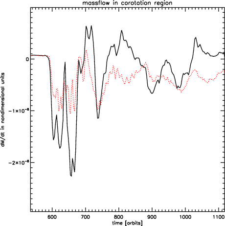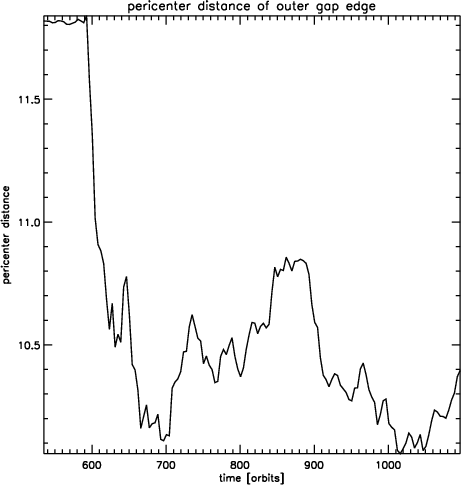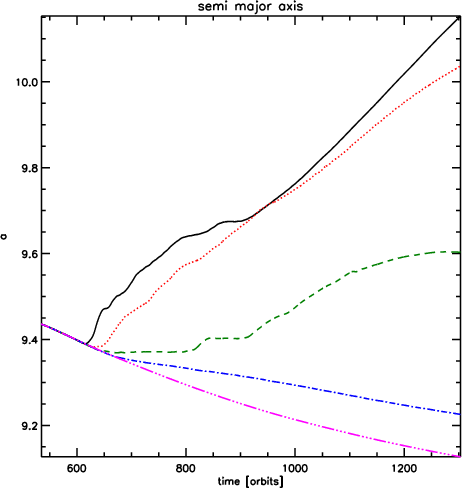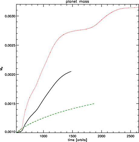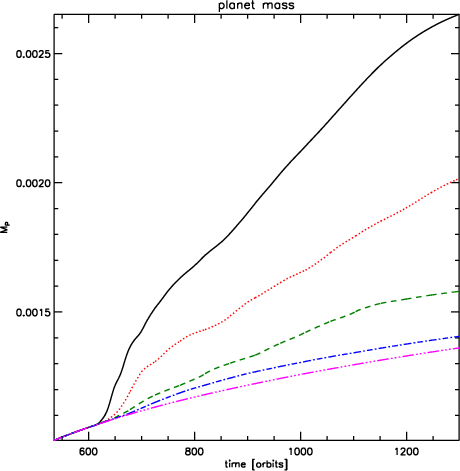 The mass accretion history for these models is shown in Fig. 19. As expected, the most strongly perturbed model results in the most rapid mass growth, as the gap is subject to greater flooding in that case. As with the migration, there is a global trend of smaller planetary mass growth for larger impact parameters, and model 8 (with q=5) shows very similar results to model 1 (without a perturber). Clearly, outward migration and enhanced accretion are strong functions of the impact parameter.