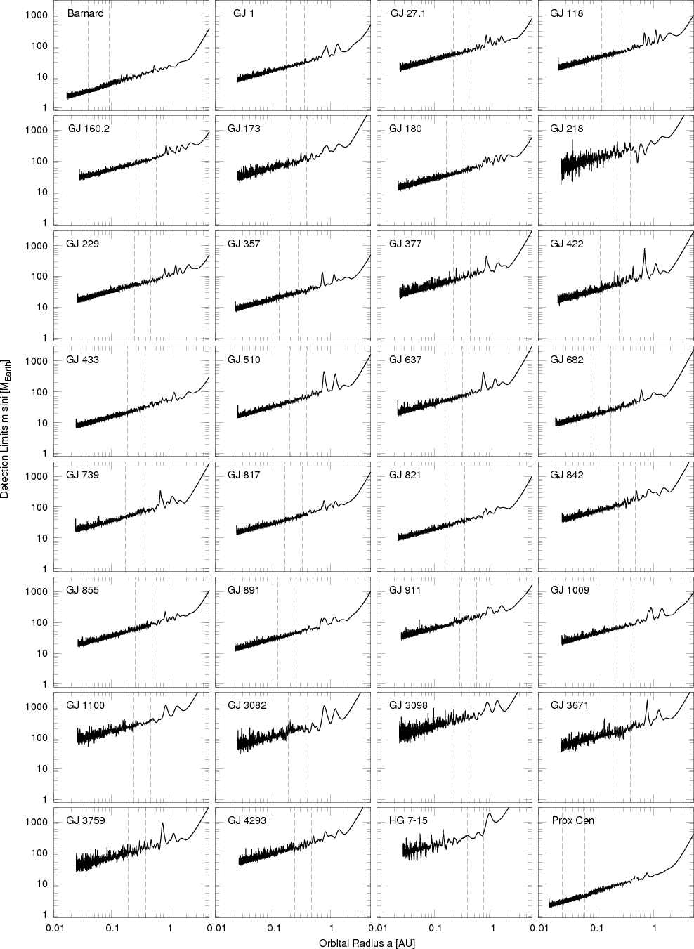 Table 3 lists the prediction for secular acceleration for all of our sample stars as derived from Eq. (2). Some stars (e.g. Barnard's star, GJ 1, and Proxima Cen) have such high proper motion that the secular acceleration can be measured (4.5, 3.7, and 0.4 m/s/yr, respectively). This effect is depicted with a dashed line for Proxima Cen and for all stars with