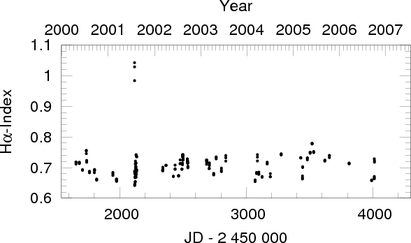 The observations started in 2000, initially with 20 targets. Typically, three consecutive spectra per night were taken for each star with exposure times of 90-900 s depending on the object brightness. In April 2004 (JD = 2 453 100) the sample was complemented by 21 additional stars, while the monitoring of HG 7-15 was ended. Since then the number of spectra per night was reduced to one, with the exception of Barnard's star, GJ 160.2, GJ 821, and Proxima Cen.