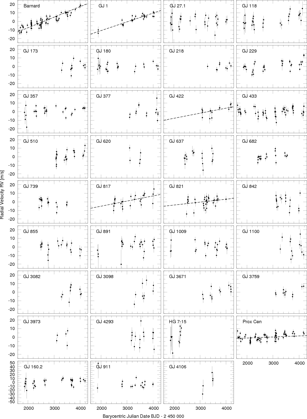 Radial velocities for 35 M dwarfs. Dashed lines represent no fit; they show the predicted secular acceleration effect caused by the proper motion (only for Proxima Cen and stars with