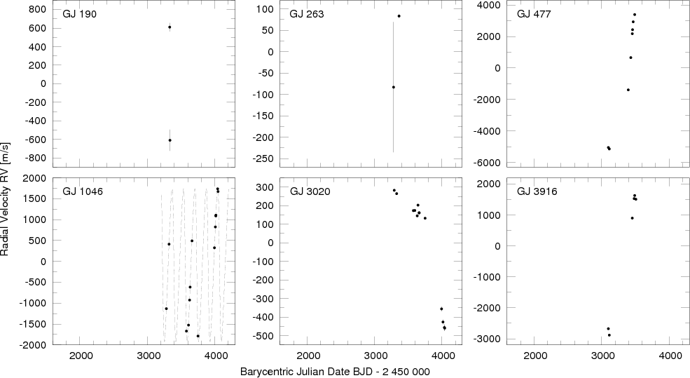 Figure 2: Radial velocities for 6 more M dwarfs. The orbital solution for GJ 1046 is taken from Kürster et al. (2008). |