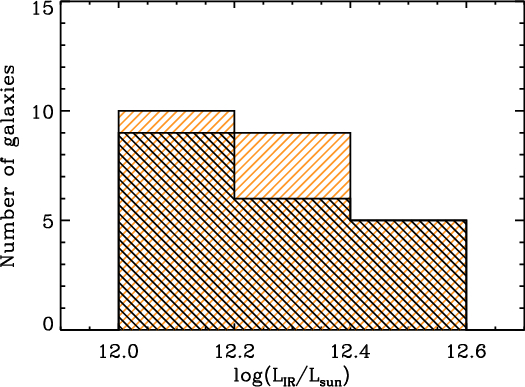Luminosity distribution of the IRAS Revised BGS (Sanders et al. 2003, orange dashed histogram) compared with our sample of ULIRGs (black dashed histogram). The luminosities of the BGS galaxies have been re-calculated to consistently compare both datasets. The luminosity range is