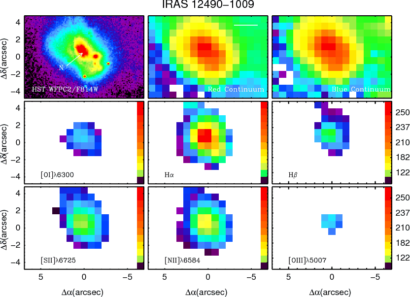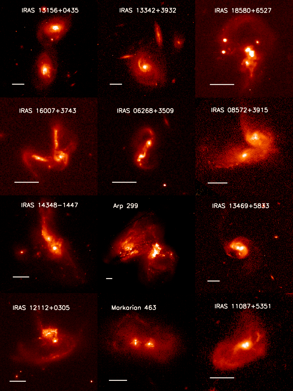 Figure 2: HST (WFPC2/F814W) images of our sample of galaxies. From left to right, up to down, the projected nuclear separation decreases (i.e., the merger evolves from pre- to post-coalescence galaxies). Orientation is north up east to the left. The scale indicates 5 arcsec. |