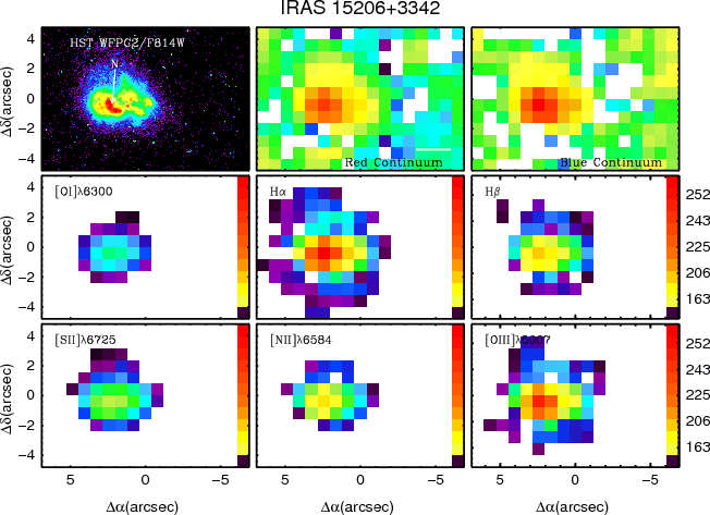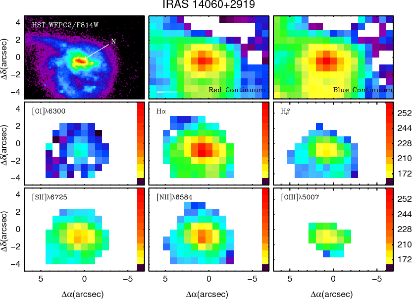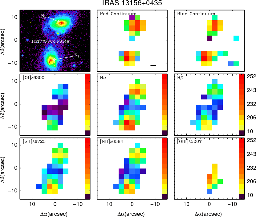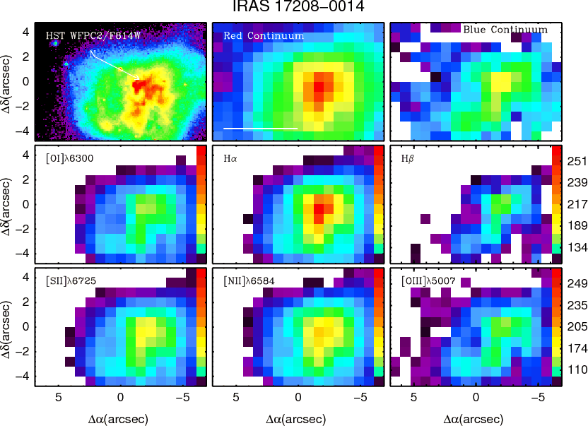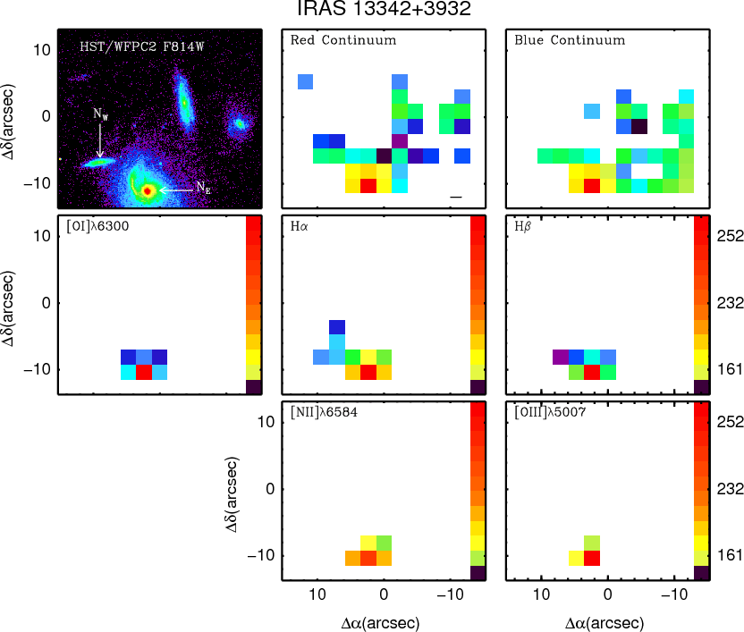 In the local Universe, where the spatial resolution allows us to study the internal galaxy structure in greater detail, comprehensive studies of local ULIRGs have been completed using imaging and long-slit spectroscopy in the optical and infrared (e.g., Veilleux et al. 1995; Genzel et al. 1998; Kim et al. 1998; Scoville et al. 2000; Farrah et al. 2001; Bushouse et al. 2002; Imanishi et al. 2007). In some cases, the combination of these images with optical two-dimensional spectral information such as that provided by integral field spectroscopy (IFS) has been used to carry out comprehensive studies of individual or a few ULIRGs (e.g., Arribas et al. 1999; Monreal-Ibero 2004; Colina et al. 2005).