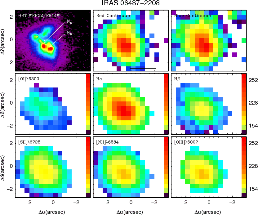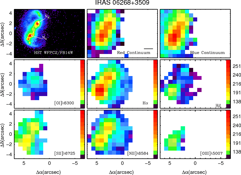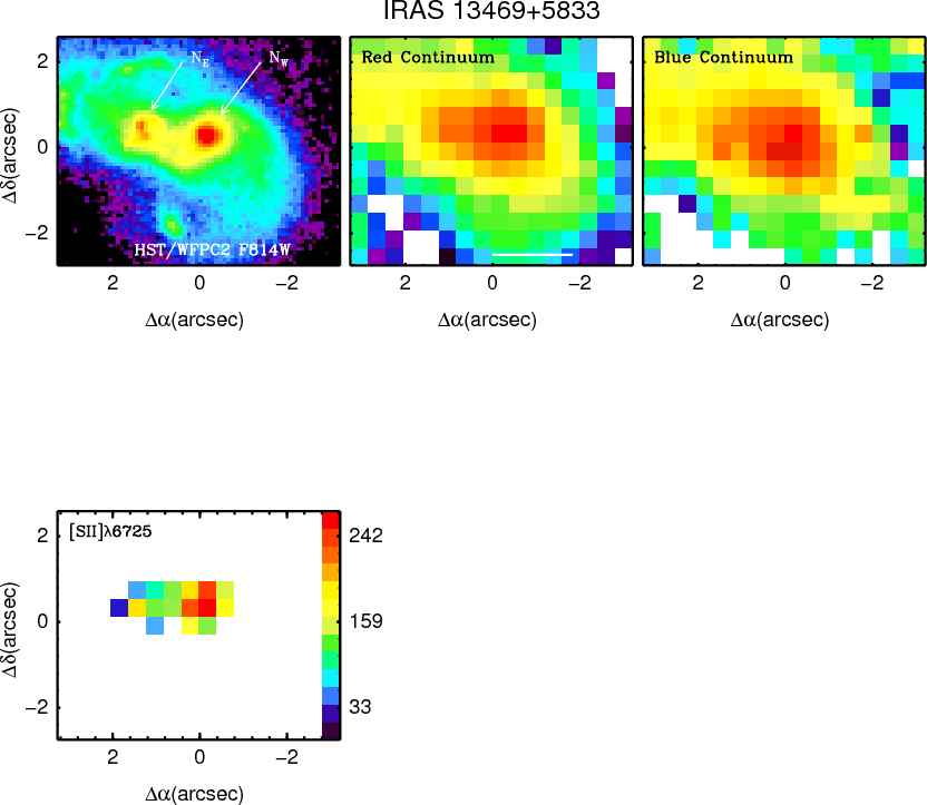Finally, the ULIRGs in our sample exhibit a variety of morphologies, from interacting disks with a projected nuclear distance up to 36 kpc, to close nuclei or individual nucleus surrounded by a common stellar envelope. There are detailed classification schemes based on the interaction stage and morphological features that lead to the existence of many classes and subclasses (see e.g., Surace 1998; Veilleux et al. 2002). We, however, chose to separate our sample of ULIRGs into two broad categories using the projected nuclear distance as a discriminator: (1) Pre-coalescence galaxies: those with a projected nuclear separation larger than 1.5 kpc. (2) Post-coalescence galaxies: those with a projected nuclear separation smaller or similar than 1.5 kpc. This accurate distance calculation was possible because of the high spatial resolution of the HST images (typical scale 0