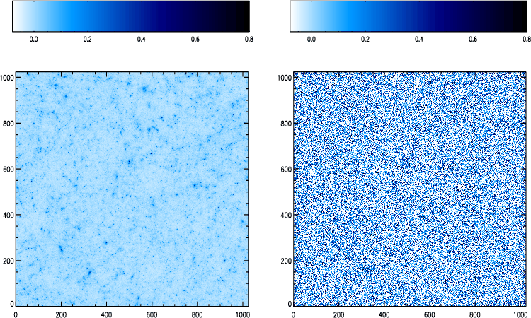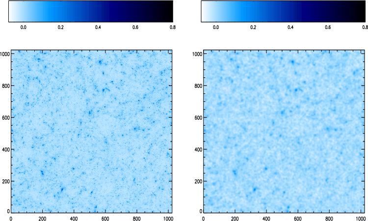 downsampled to 10242 pixels and we assume that the sources lie at exactly z=1. On large scale, the map clearly shows a Gaussian signal. On small scales, the signal, in contrast, is clearly dominated by clumpy structures (dark matter halos) and is therefore highly non-Gaussian.