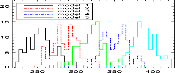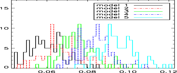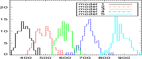 Figure 8: Distribution of the wavelet peak counting estimated at the third scale of an isotropic wavelet transform on the simulated realizations of the 5 models. It illustrates the results of the Table 7. We obtain a good discrimination even for adjacent models. |