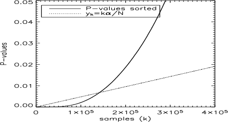 This technique was described by Pires et al. (2006); Hopkins et al. (2002); Miller et al. (2001); Starck et al. (2006b) for several astrophysical applications. Instead of controlling the chance of any false positives, FDR controls the expected proportion of false positives. The FDR is given by the ratio of declared active pixels (12) that are false positives, i.e.,