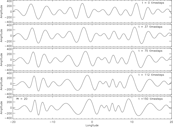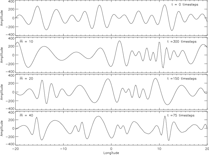 Figure 3: The top image shows an initial supergranule pattern. Those that follow show the resultant patterns of advection by different sized giant cell components after a particular number of timesteps. |