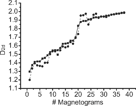 This work is structured as follows. Section 2 describes the data used in this study along with the necessary corrections imposed on them. Section 3 discusses the box counting and extrapolation techniques applied to our dataset, aiming to reveal correlations between 2d and 3d magnetic domains. Important parameters and quantities used are explained in detail, whereas work-around solutions on standard methodology drawbacks are suggested. Section 4 presents our results and discusses our findings. Finally, Sect. 5 summarizes our conclusions.