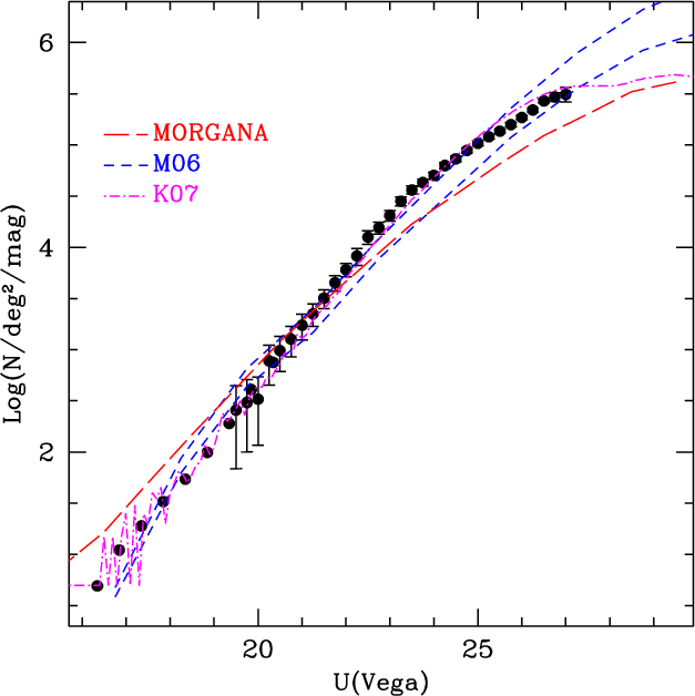 Results. The shape of the galaxy number counts in the U band can be described by a double power-law, the bright side being consistent with the shape of shallower surveys of comparable or greater areas. The slope bends over significantly at U>23.5 ensuring the convergence of the contribution by star-forming galaxies to the extragalactic background light in the near-UV band to a value that is more than 70% of the most recent upper limits derived for this band. We jointly compared our near-UV and K band counts collected from the literature with a few selected hierarchical CDM models, concentrating on specific critical issues in the physical description of the galaxy formation and evolution.