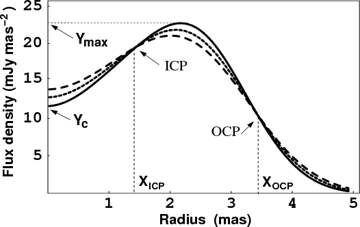 - As can be seen in Fig. 5, there are two crossing regions, one at the inner edge and the other at the outer edge of the profile. For determining source sizes, we are primarily interested in the outer crossing region.