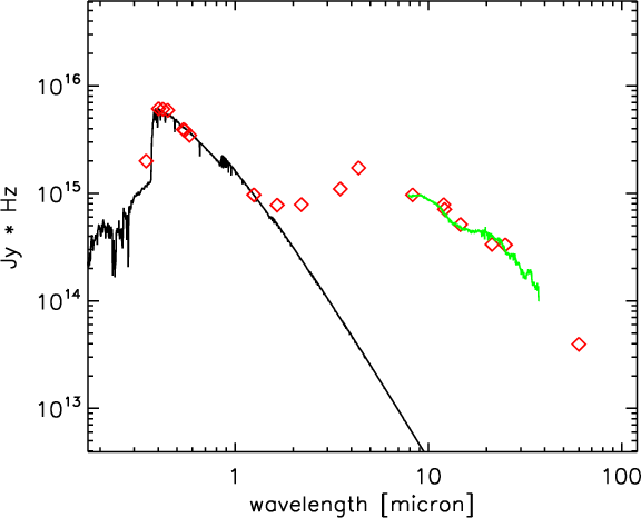 Figure 1: The SED of IRAS 19125+0343. The SED is typical for the sample, showing a large and broad IR-excess. A total reddening of E(B-V)=1.1 was deduced by minimizing the difference between the dereddened broadband fluxes (diamonds) and the appropriate model atmosphere (full black line). The infrared excess was not considered in this minimalisation. The Spitzer infrared spectrum (Gielen et al. 2008) is also shown. |