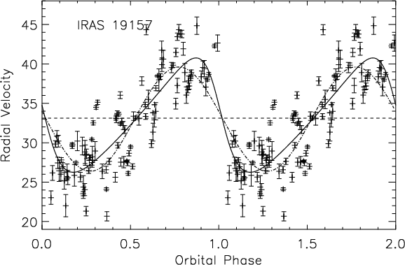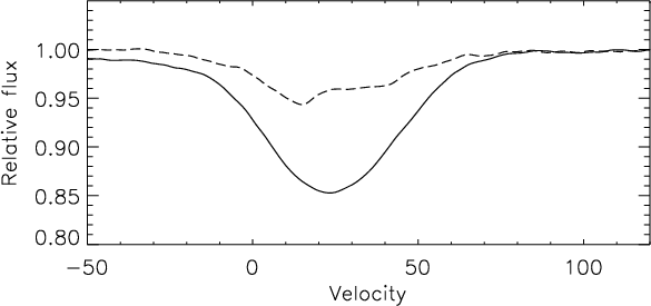 Figure 2: Comparison between cross-correlation profiles obtained with a standard spectral mask (dashed line) and with a software mask adapted to the individual spectral characteristics of IRAS 19157-0247 (full line). |
