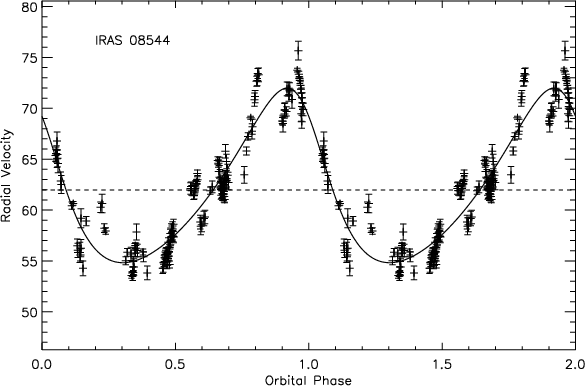 In Fig. 2, we compare the cross-correlation profile obtained by the standard mask with the one obtained by the specific mask, constructed on the basis of the high signal-to-noise ratio spectrum for IRAS 19157-0247. No accurate velocity can be derived by using the standard mask, while a Gaussian fit of the profile, obtained by the specified mask for IRAS 19157-0247, provides a good estimate of the radial velocity.