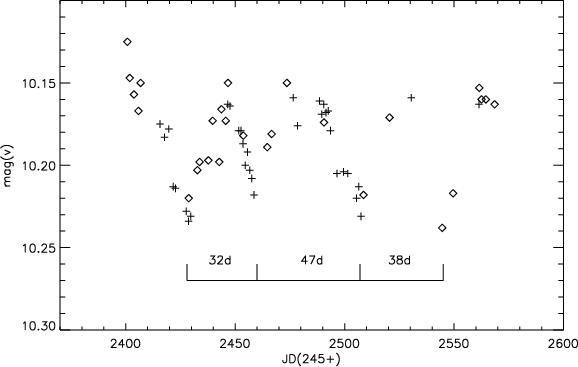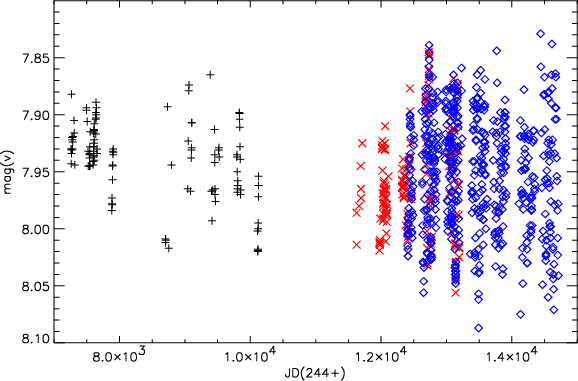 For the variability study, we used phase dispersion minimization PDM (Stellingwerf 1978) and, for the photometric data, the Lomb-Scargle method to search for periodicities. The orbital solutions were then computed using an altered version of the Fortran code VCURVE (Bertiau & Grobben 1969) as well as the minimisation code FOTEL (Hadrava 2004). The weights of the individual velocity points were based on the rms values of the bisector analyses. All errors quoted in the individual orbital elements are rms errors of these elements calculated from the covariance matrix. Plots of the photometry of single seasons were used to look at the individual cycles in some cases. The individual photometric datapoints are given in Tables 5 and 6.