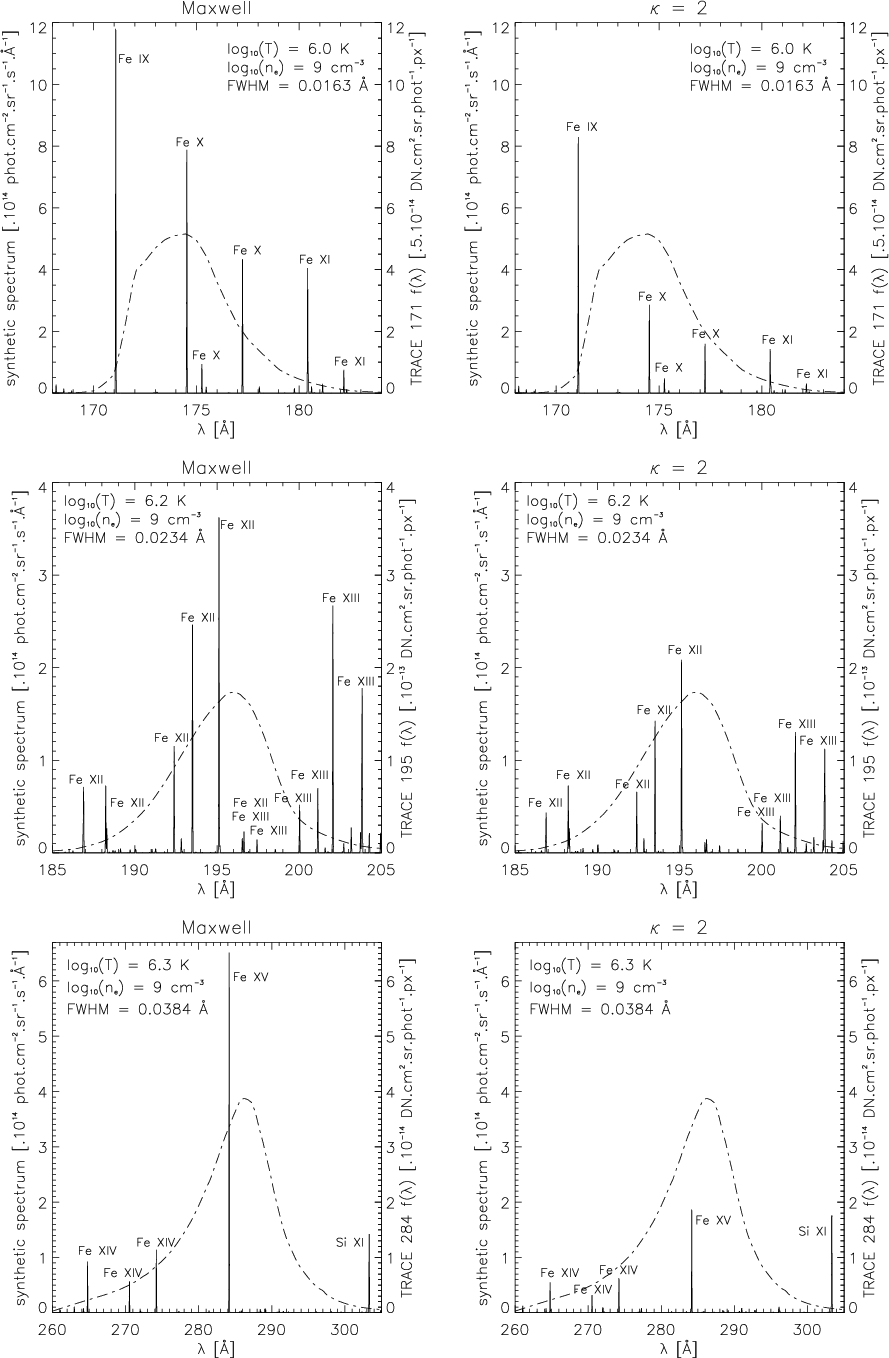 The commonly used EUV spectral windows located in the neighborhood of the wavelengths of 171 Å, 195 Å and 284 Å are dominated by lines of various Fe ions. The situation is illustrated in Fig. 1 for Maxwellian and -distribution with